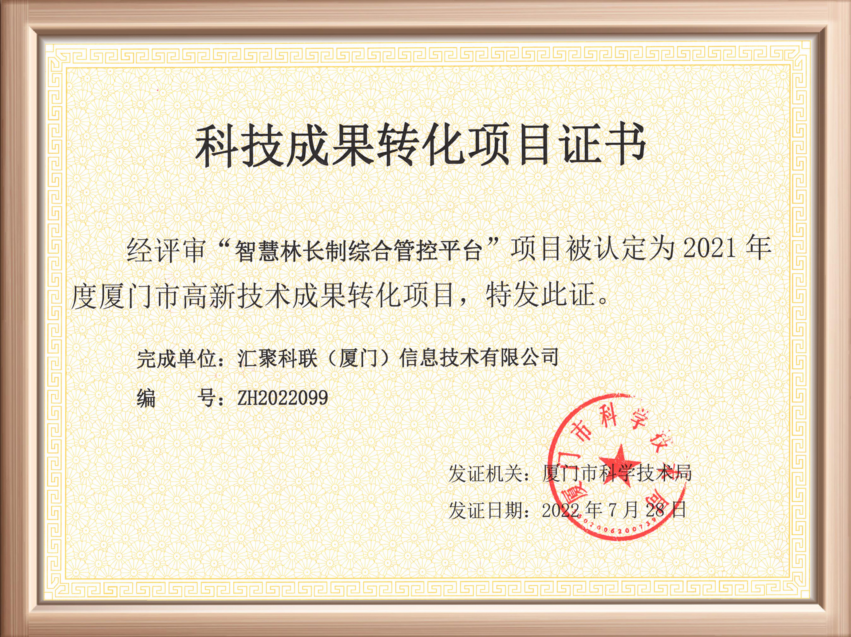 近日,匯聚科聯(lián)收到廈門市科技局頒發(fā)的“科技成果轉化項目證書”,公司“智慧林長制綜合管控平臺”經過評選,成功被認定為2021年度廈門市高新技術成果轉化項目。